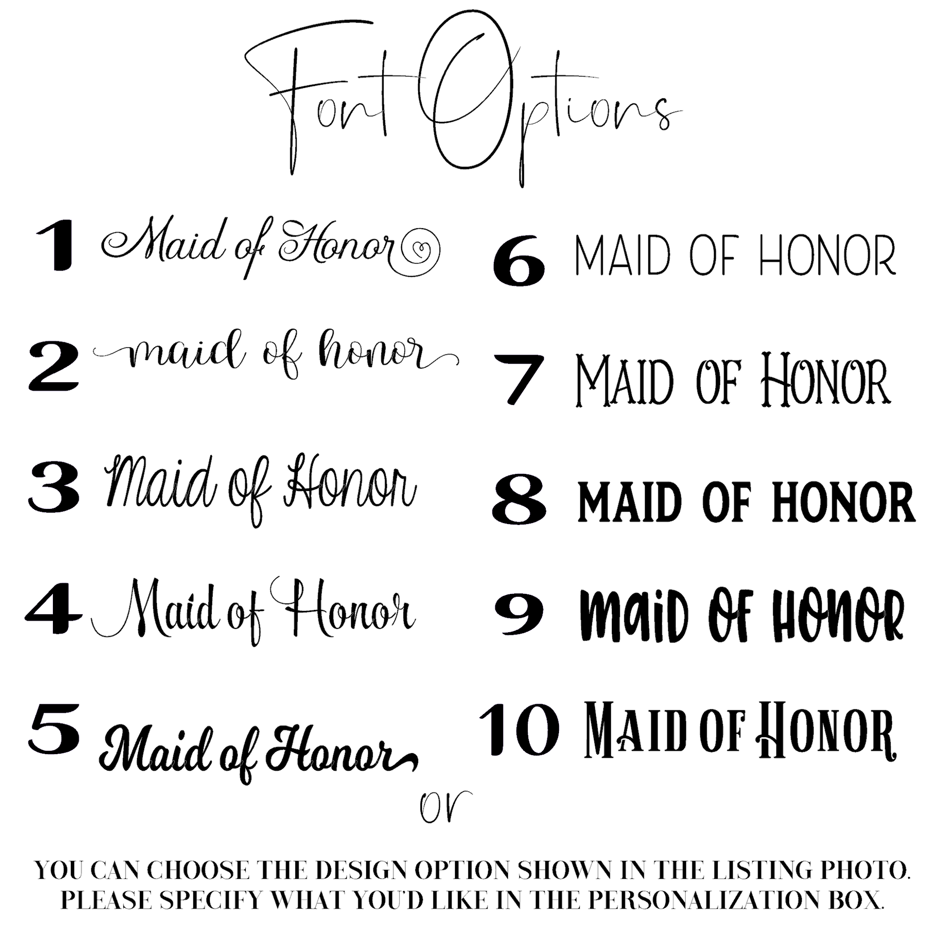 Make it uniquely yours with personalization that can include titles (Maid of Honor, Best Man, Bridesmaid, etc.), names, wedding dates, or something else entirely! Choose between permanent commercial-grade vinyl or upgrade to timeless engraving. Enter your personalization details, along with font and color preferences (for vinyl), in the box below.