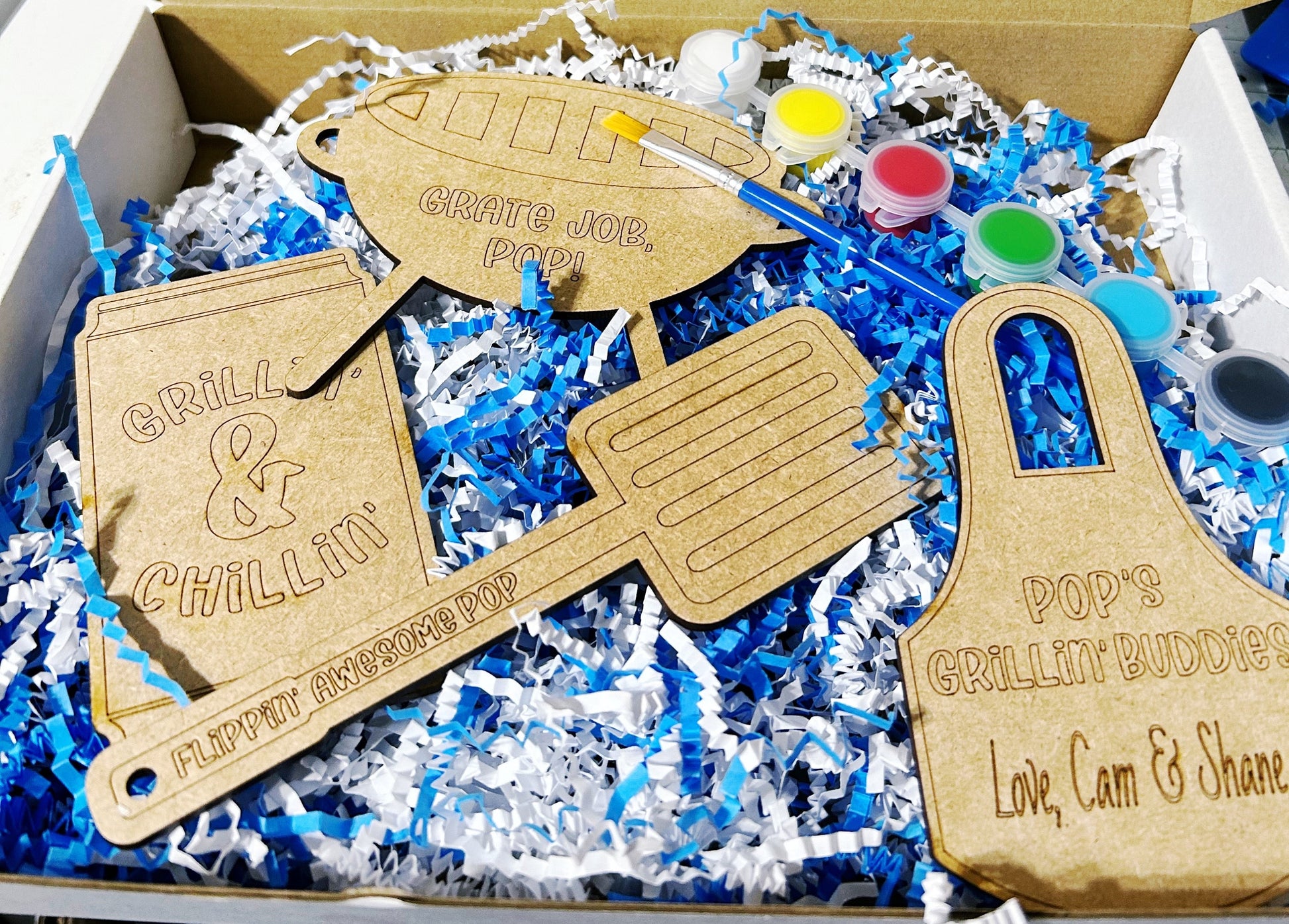 Finally you can stop looking for the perfect Fathers Day gift! Your kids can make great memories painting dad or grandpa’s gift and it will be a treasured present for him. This Father’s Day DIY paint kit comes with four items to paint (apron can be personalized with your kids names!). Each piece is made from wood and measure approx 6-7 inches. You can even add magnets to the back in the drop down menu. Feel free to reach out with any questions, I love hearing from my clients!