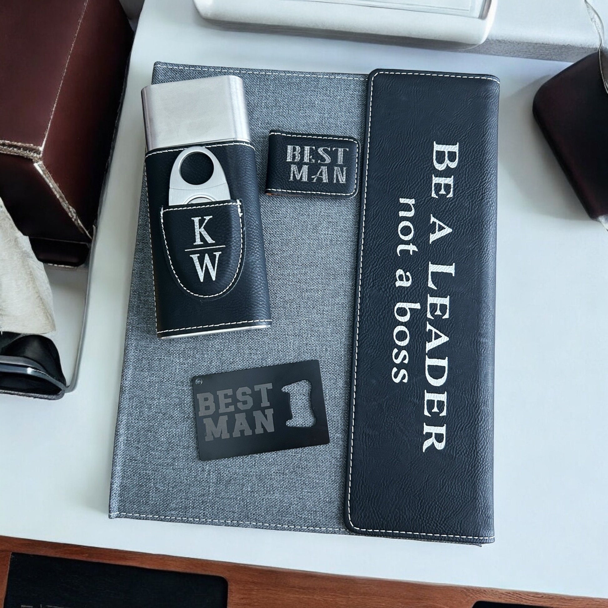 Celebrate the bond of friendship and honor the special men in your wedding party with our Personalized Gift Set, a collection of finely crafted essentials designed to impress. This comprehensive set includes an engraved 9x12 padfolio, cigar case, money clip, and bottle opener keychain, each meticulously detailed to reflect your appreciation and gratitude.