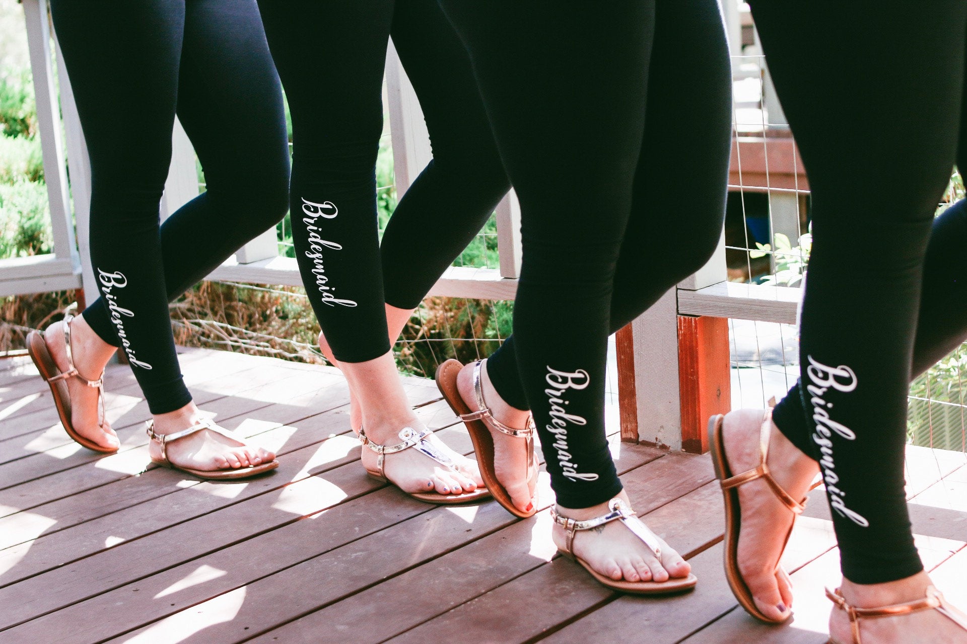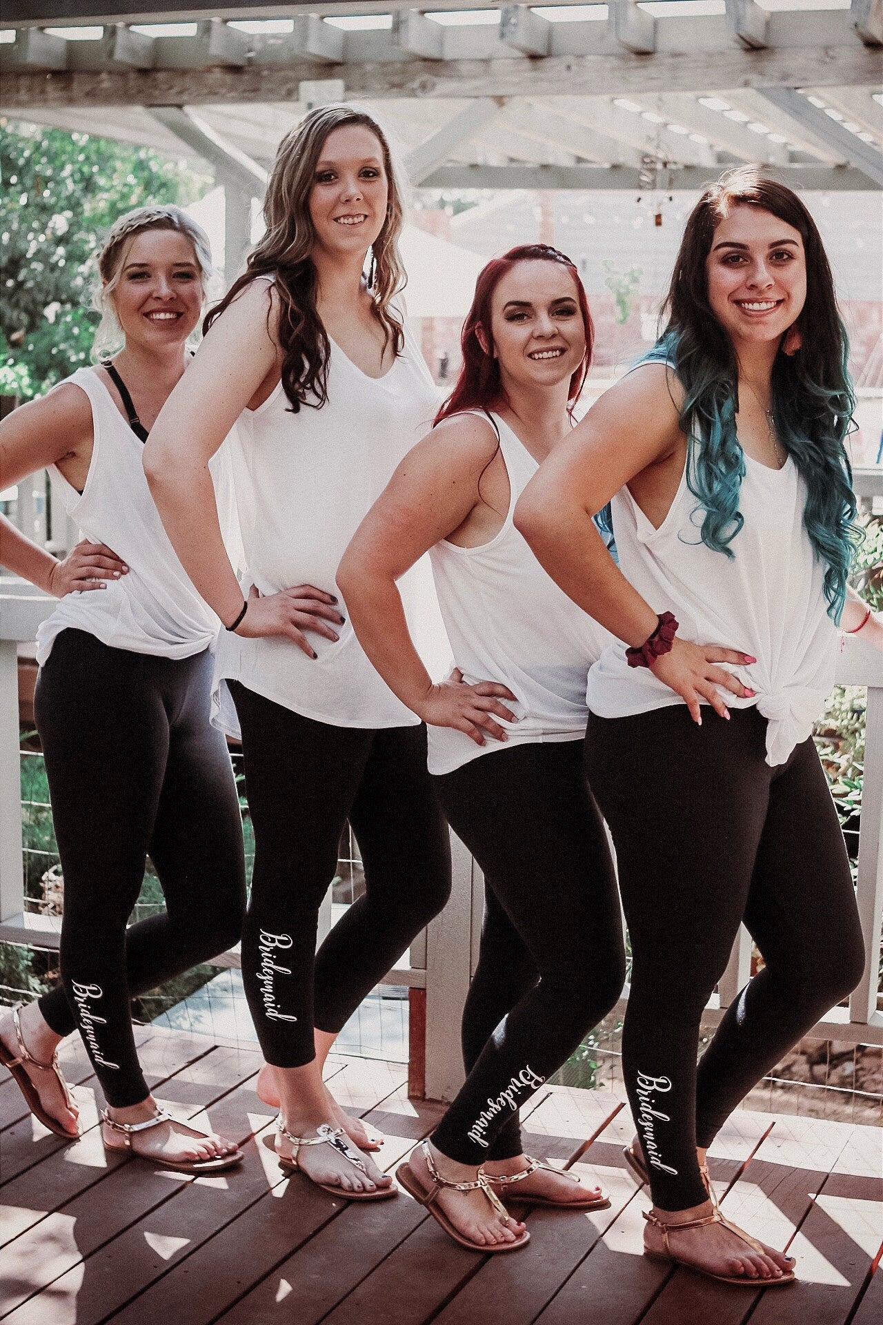 Looking for the perfect bridal party gift idea? These bridal party leggings are exactly what you need! You can customize with any color or font shown in the photos to make them match your color scheme, theme, and personality. These will keep everyone comfortable while hair & makeup are happening!